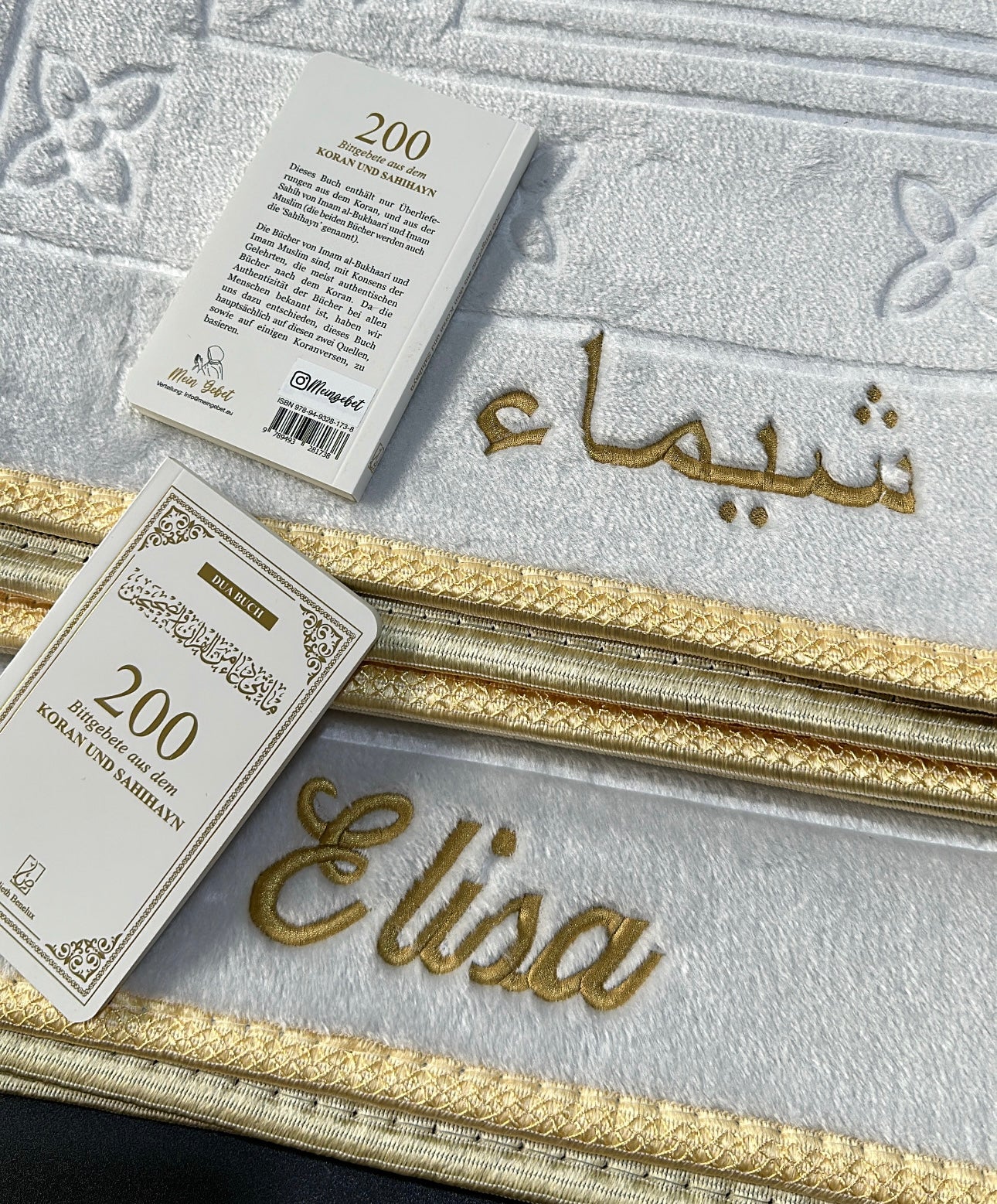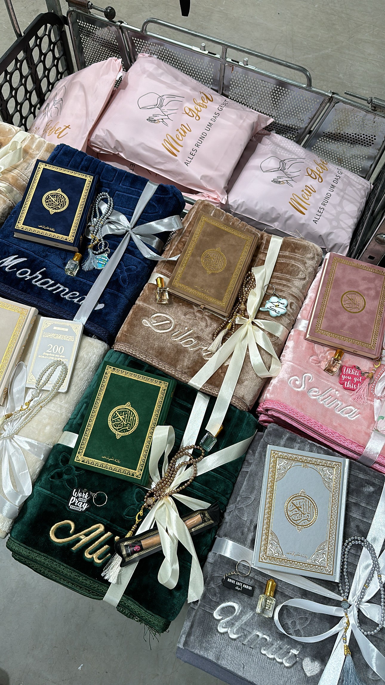 Unser personalisierter Gebetsteppich, zusammen mit Gebetskette, Quran, Misköl, Schlüsselanhänger & Bittgebetbuch, bildet ein einzigartiges Geschenk für deine Liebsten!